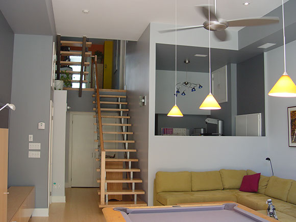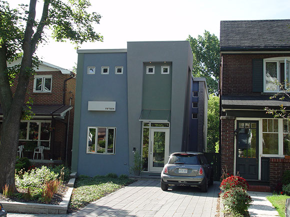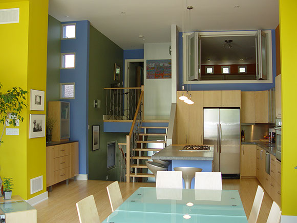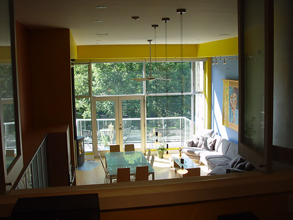 to the street and two stacked 1 1/2 storey spaces towards the rear yard on a narrow but deep sloping lot. The Owners' lifestyle emphasizes formal and informal entertaining, and the collection of contemporary art and sculpture, thus defining 2 principal spaces of differing characters, both of which offer large wall spaces for the display of artworks. The design creates open, functional spaces in a contemporary envelope which can morph with the desires of the occupants.