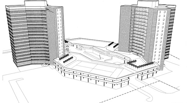 This project is a prototype for the densification of existing commercial mall sites. The project includes: