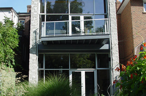 to the street and two stacked 1 1/2 storey spaces towards the rear yard on a narrow but deep sloping lot. The Owners' lifestyle emphasizes formal and informal entertaining, and the collection of contemporary art and sculpture, thus defining 2 principal spaces of differing characters, both of which offer large wall spaces for the display of artworks. The design creates open, functional spaces in a contemporary envelope which can morph with the desires of the occupants.